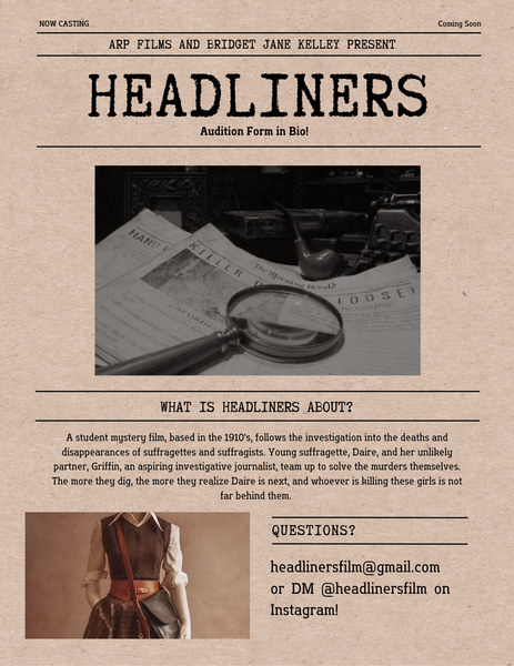 Headliners is Bridget Jane Kelley's newest work and first screenplay! The casting process is currently taking place, as well as the crew application opportunities! Marketing and social media management for Headliners has been Bridget's favorite creative outlet these past few months, with big announcements coming soon, she cannot wait until the next time she hops on Canva!